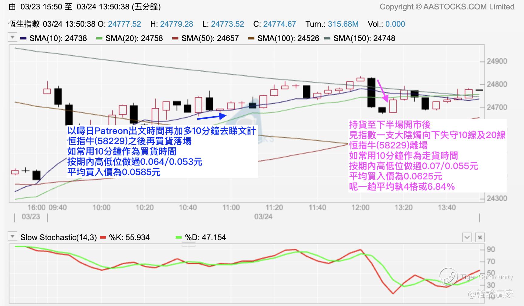 㖊日拣咗只 $UB#HSI RC2807I.C(58229)$ 出嚟,都比较贴价,原因系攞佢嚟做一趟五分钟图嘅Swing Trade,借住10线同保历加通道中轴,谂住大回都会有小涨挂;只系无谂到个涨系上返25000点咁啫。