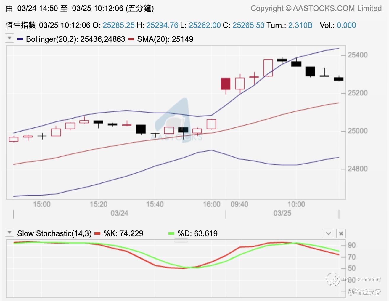 10点前有见指数上到作战室目标位(小时图50线)后已经收割咗,再到依家10点12分,恒指高位向下回落100点左右,而喺五分钟图上亦见指数处于保历加顶线同10线之间运行;如果失守嘅话,将10线向下移到用20线咁玩。