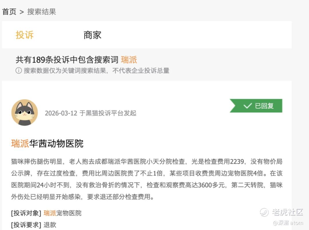 在黑猫投诉,对于瑞派宠物的投诉量来到了189条,投诉内容不乏误诊、乱收费、价格不透明等。比如,有用户反馈瑞派宠物存在检测价格不透明,过度检测的情况。