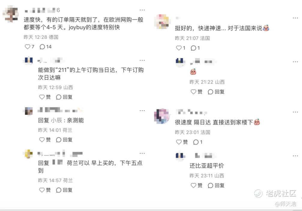 Joybuy推出“211限时达”服务。具体来说,消费者在上午11点之前下单,商品能做到当日达。如果在晚上11点之前下单,商品会在次日下午送达。这个速度在欧洲市场非常有竞争力,小红书上很多IP为海外的网友对此评论:“这是真的,而且速度超出预期的快,简直神速”。