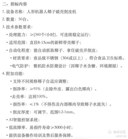 媒体披露了椰树集团发布的关于采购人形机器人用于破壳等加工流程的招标公告,公告围绕技术、系统控制、易损件寿命等方面提出了明确的具体要求。