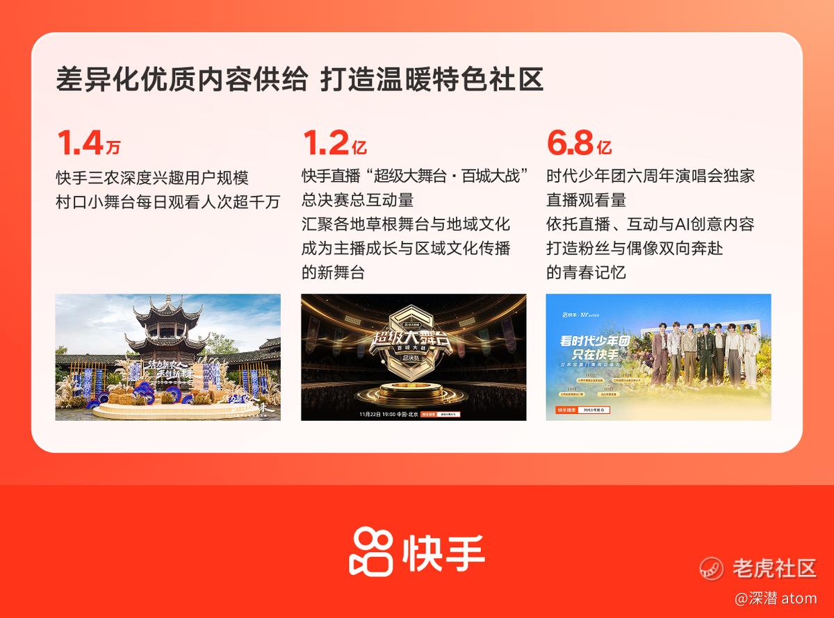 互动生态方面,私信互动玩法持续创新,推动日均双关私信渗透率同比提升近3%。内容供给方面,平台持续打造具有快手特色的差异化内容生态,真实内容、特色垂类与区域文化内容保持活跃,进一步强化社区温度与平台辨识度。