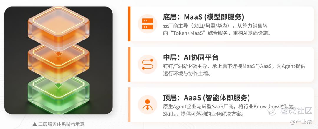这种AI自主执行的确定性,反射到B端的企服产业结构对应的改变则是不管最前端SaaS软件,还是钉钉、飞书、企业微信等协同路由平台(B端流量入口),甚至是底层的基建层,都必须完成基于AI服务模式(AaaS模式)的新进化。