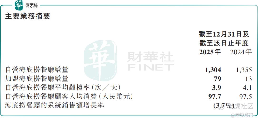 在门店布局上,截至2025年末,海底捞品牌共经营1383家餐厅。其中,自营1304家(年内新开79家,关停或搬迁85家,45家自营转加盟),年内净减少51家;加盟门店则从13家快速扩张至79家。