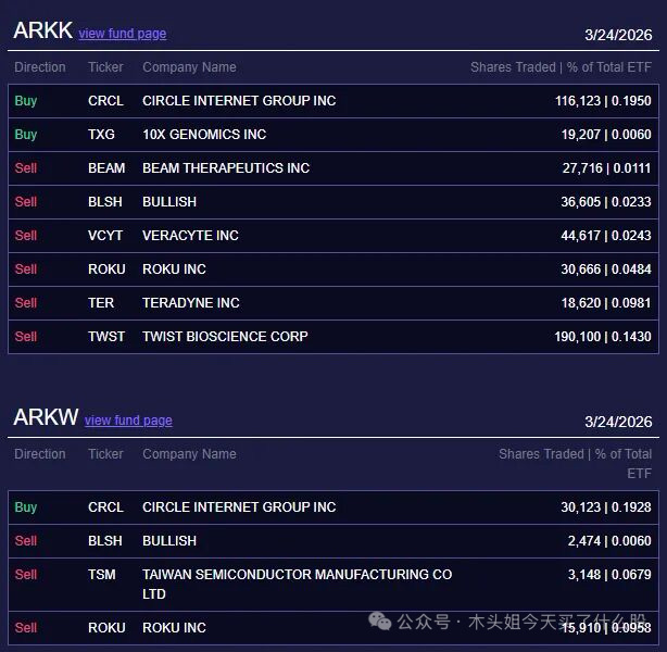 木头姐今天买入1600万美元CRCL 卖出150万美元BLSH