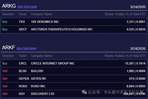 木头姐今天买入1600万美元CRCL、45万美元TXG、3万美元ARCT。