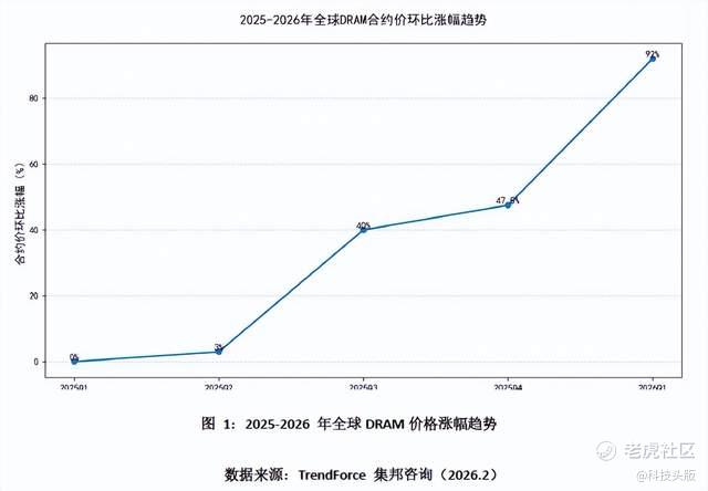 据集邦咨询在今年2月发布的数据,近3个月存储芯片现货价格累计涨幅已超300%,预计2026年第一季度DRAM价格涨幅将达80%至95%。