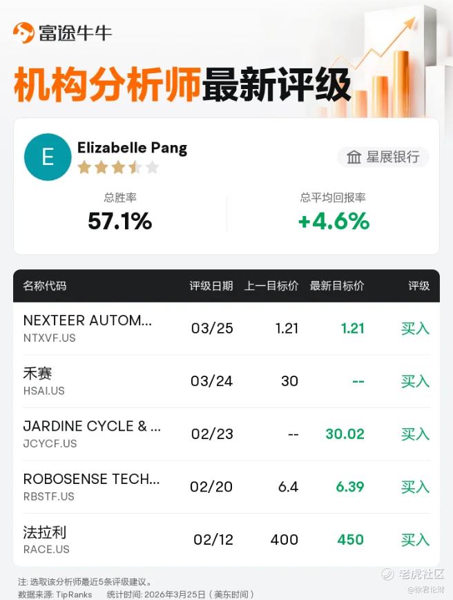 星展银行分析师Elizabelle Pang维持$禾赛 (HSAI.US)$买入评级。