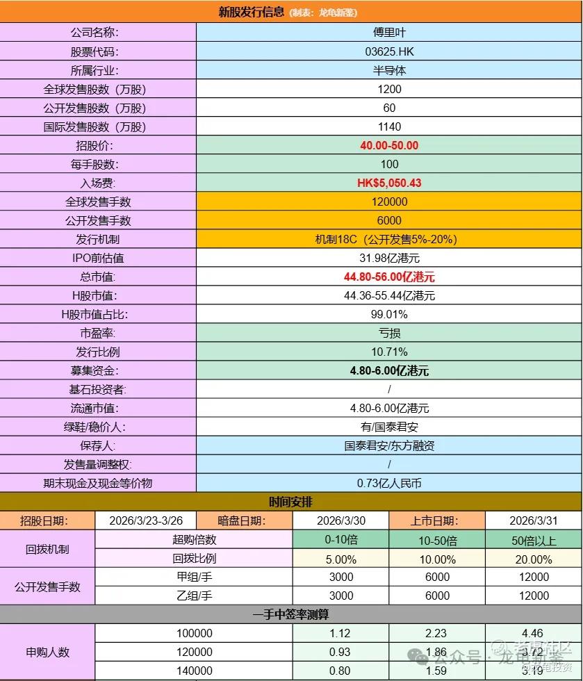 本次全球发售股数1200万股,每手股数100股,招股价40.00-50.00港元,入场费5050.43港元,采用机制18C发行,公开发售手数6000手,触发回拨后24000手,预计10-14万人参与,一手中签率3%左右,申购500手稳一手。