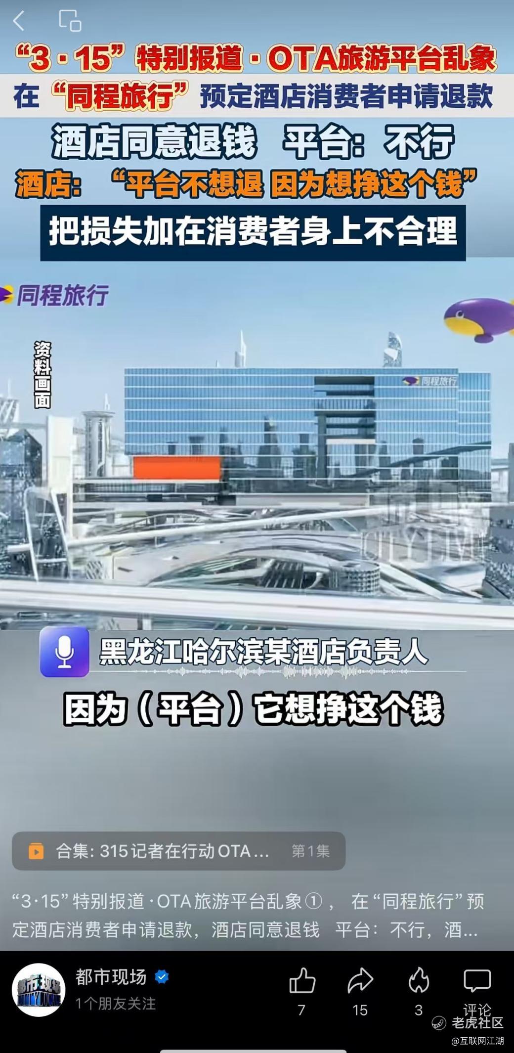 比如今年3月14日,江西广播电视台旗下的《都市现场》曝出:有消费者在“同程旅行”平台预订酒店后,因卫生问题提前离店,却遭遇平台以“预订后不可变更或取消”为由拒绝退还剩余房费,即使酒店方已同意退款,但因平台复杂的客服机制而沟通无门。