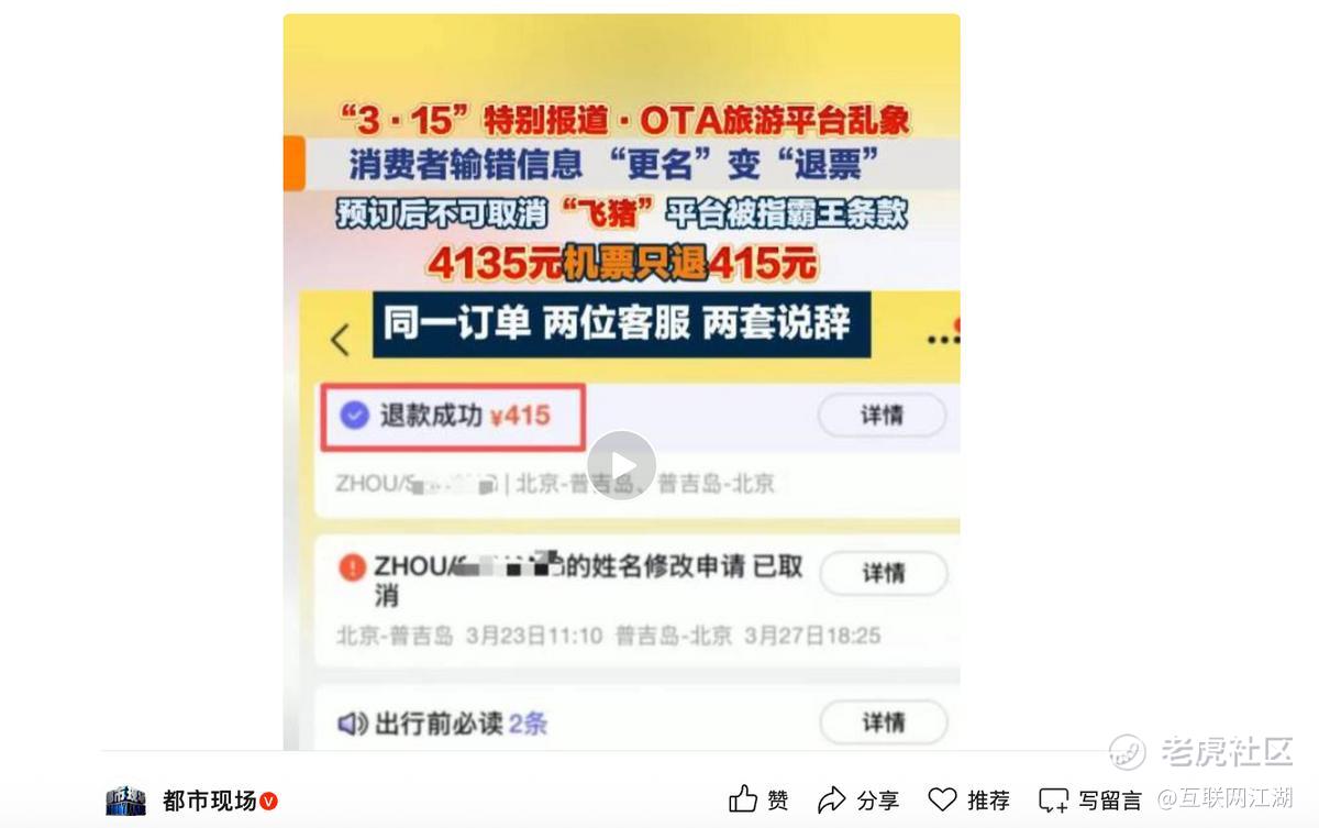 《北京一女士在飞猪预订机票,下单不到1小时取消重买,4000多票款仅退回415元;平台“不可取消”规则被指“隐藏性强”、比航司更严苛》——都市现场