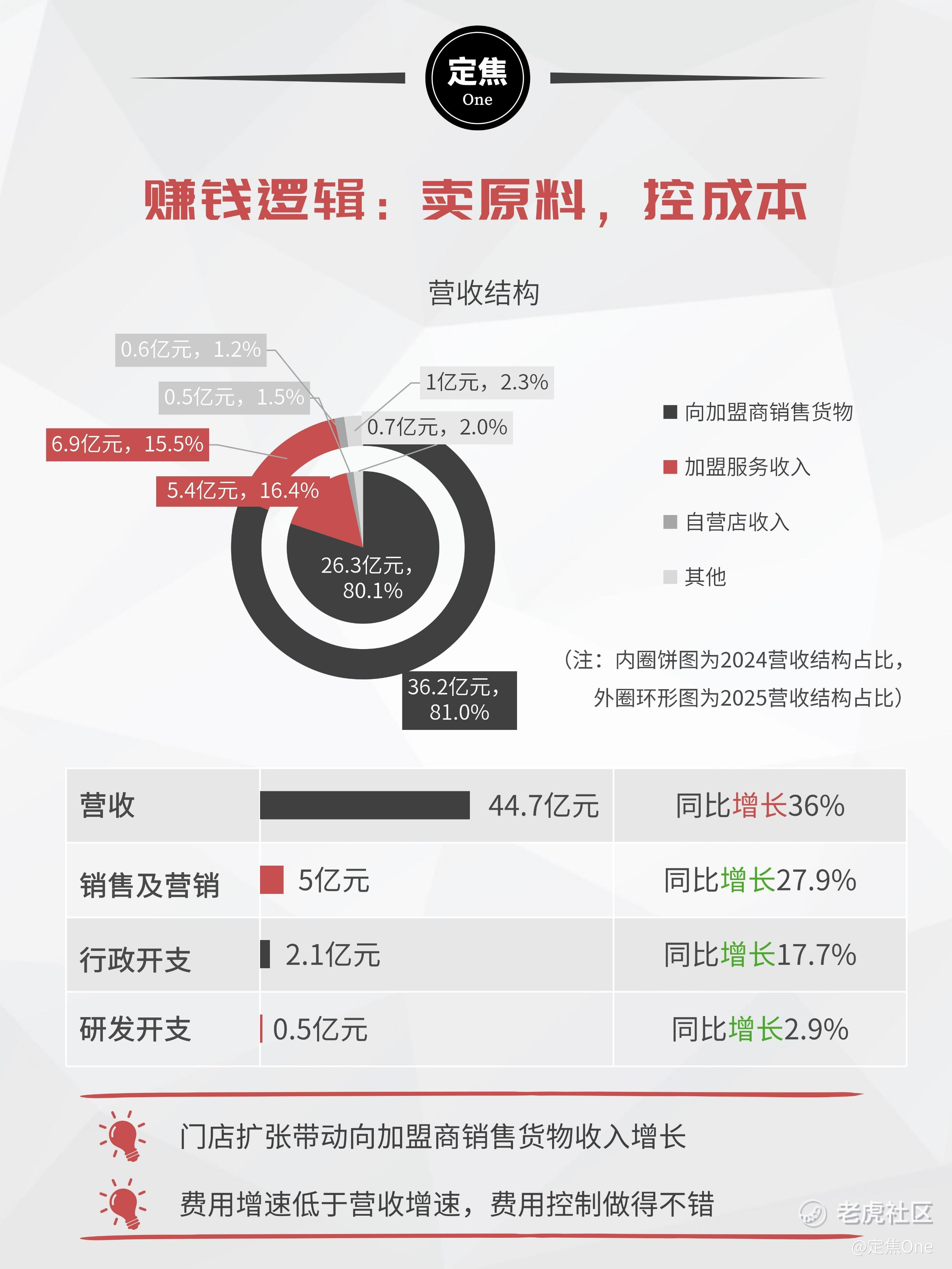 门店扩张方面,在2025年11月,沪上阿姨全球门店总数已经突破万店,2025年年报中门店已达11449家,同比增长24.8%,其中加盟店11423家,占比超99.7%,直营店仅26家,较上一年同期仅增长2家。不过,2025年仍有1383家加盟店闭店,此前还爆出过加盟商因利润被挤压而维权的事件。如何平衡和加盟商的关系成为沪上阿姨要面对的问题。