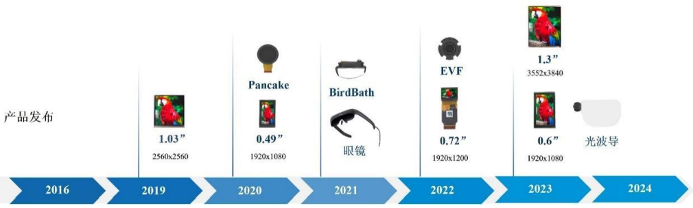 2022年高通发布骁龙XR2无线AR智能眼镜参考设计,便采用了由视涯科技提供的双OLEDoS显示器。时至今日,视涯科技已形成覆盖0.3英寸至1.4英寸不同尺寸、不同规格的产品阵列。