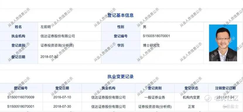 中证协官网资料显示,左前明的执业登记机构登记为信达证券,登记类别为一般证券业务。2018年7月30日,左前明在信达证券的登记类别变更为证券投资咨询(分析师)。截至3月25日,左前明在信达证券的登记状态仍显示正常。