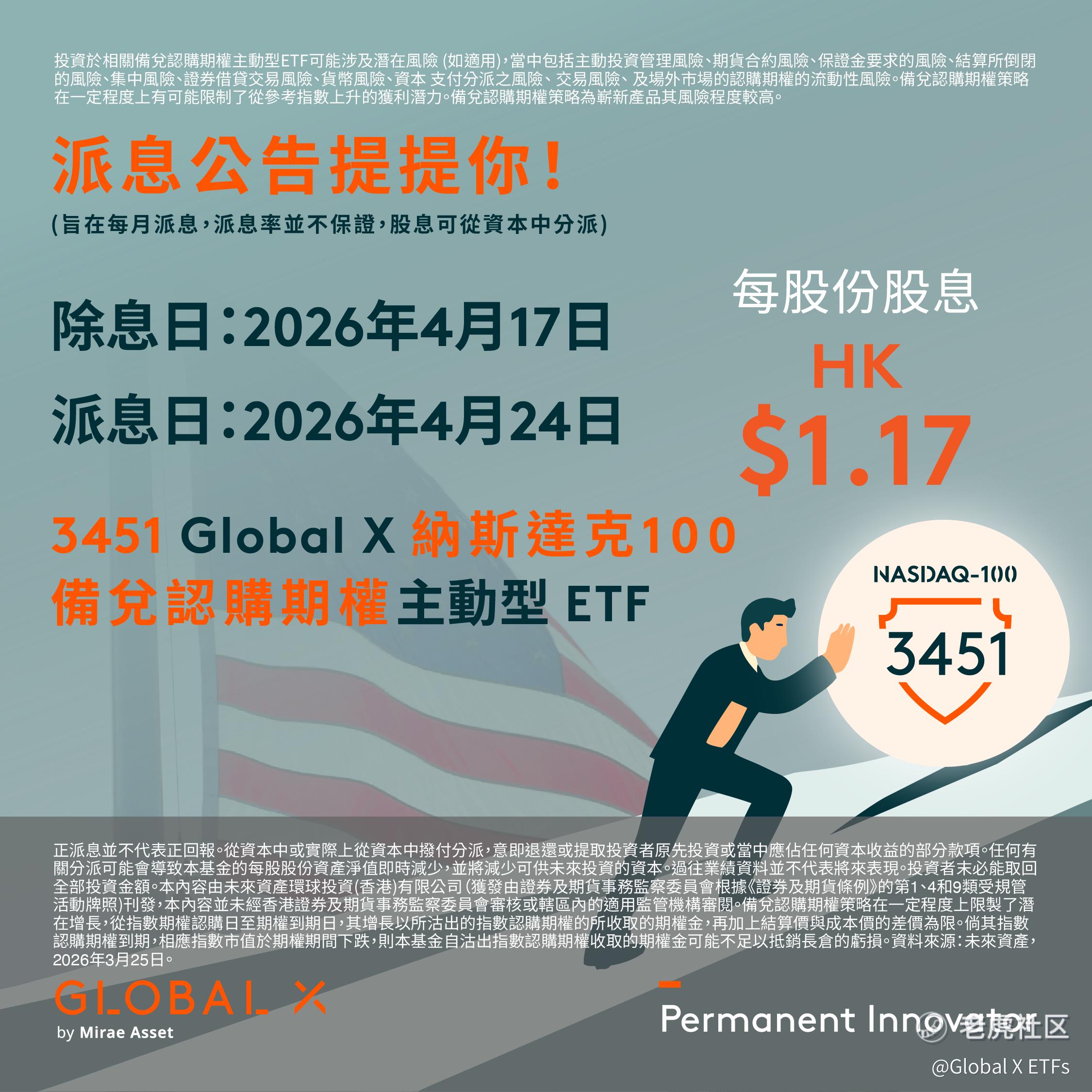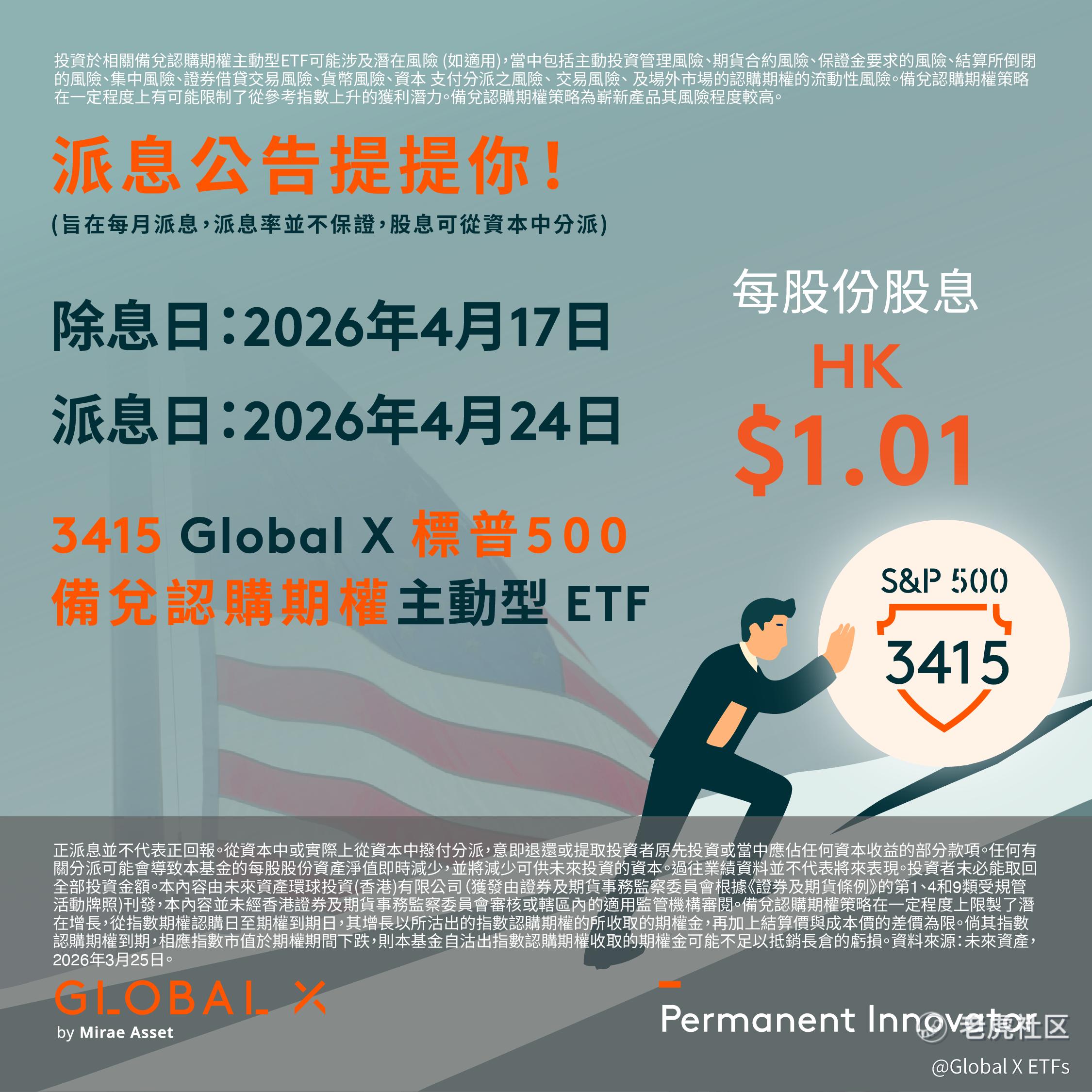 Global X标普500备兑认购期权主动型ETF(3415/ 9415)及Global X 纳斯达克100备兑认购期权主动型ETF (3451/ 9451) 即将派息!