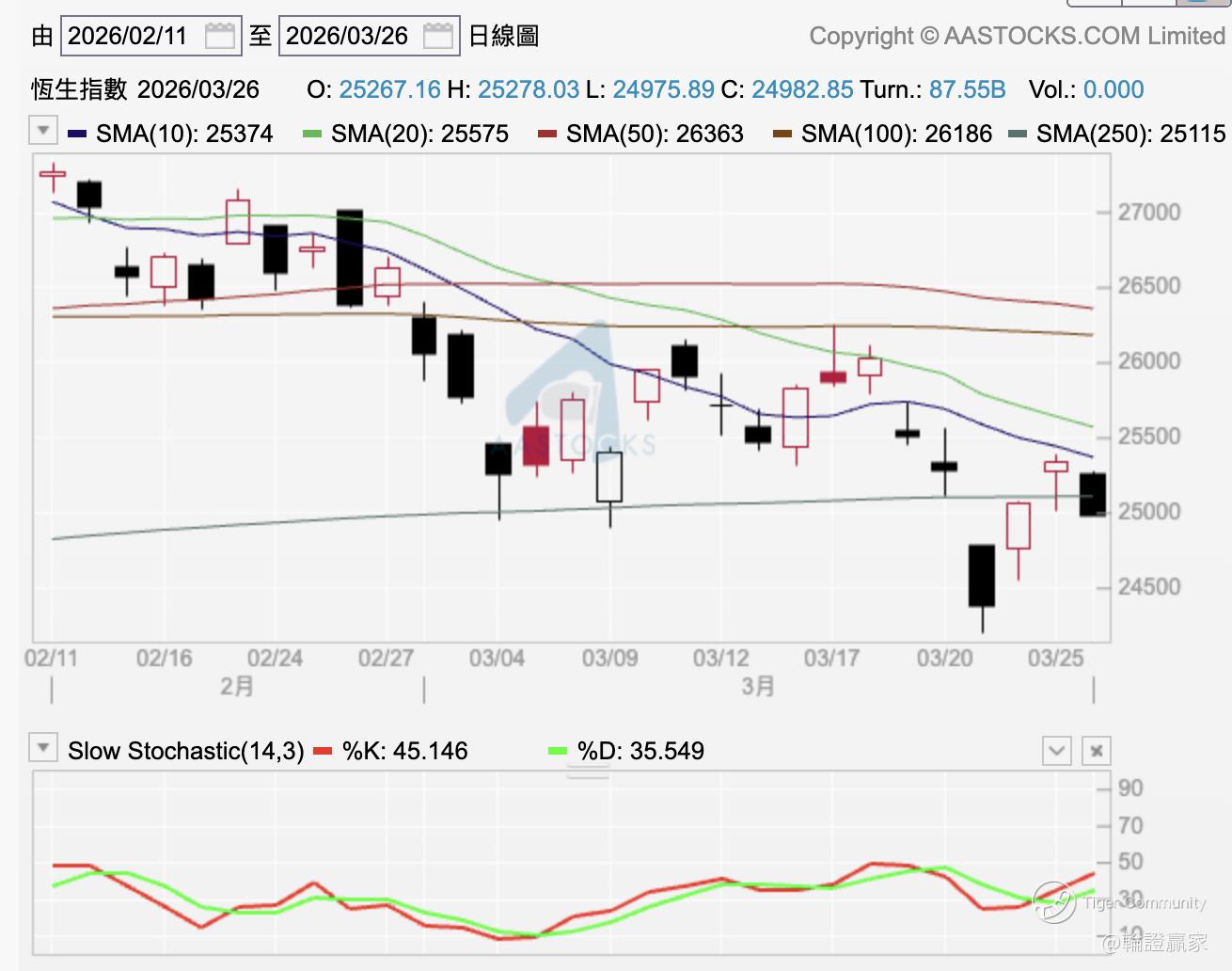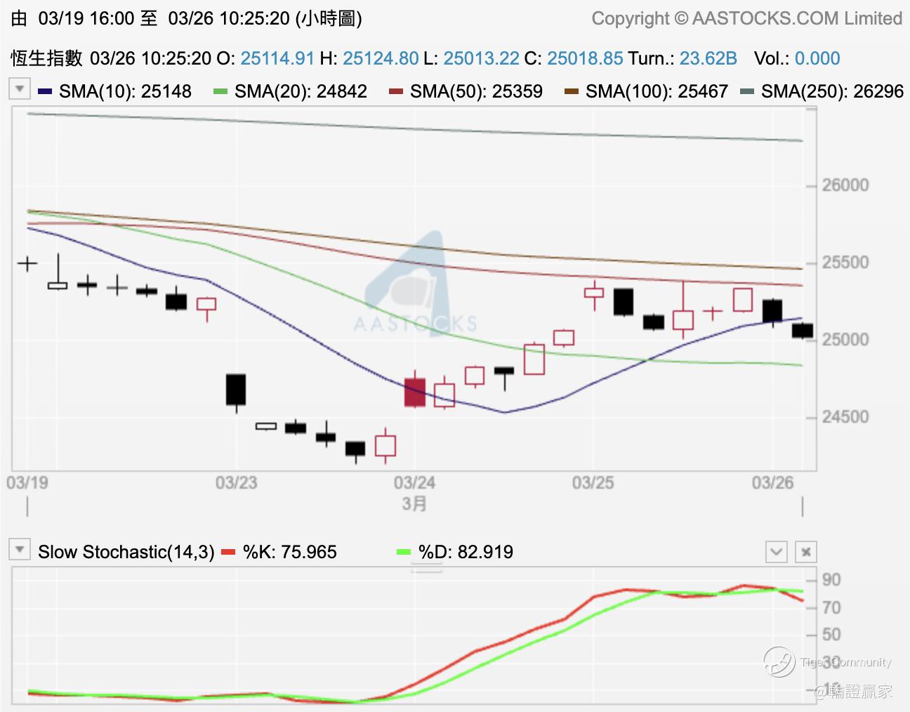 今朝 $HSI(HSI)$ 开市都只系跌68点,呢个幅度比早排嘅都算少,不过喺日线同小时图上都见到指数系被两条平均线夹住,而五分钟图SLow STC(14.3)则触顶向下样,所以作战室先比出淡仓,短短地Mark住100点位做目标先。