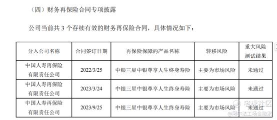 截至2025年末,中银三星共有3个存续有效的财务再保险合同,分入方均为中国人寿再保险有限责任公司,签订于2022年和2023年,保障产品均为中银三星中银尊享人生终身寿险,转移的风险主要为市场风险,但三份合同的重大风险测试结果均为“未通过”。