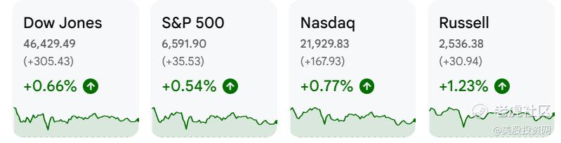 截至收盘,道指收涨0.66%,标普500上扬0.54%,纳指收涨0.77%。此外,罗素2000小盘股指表现活跃,涨幅超1.2%。