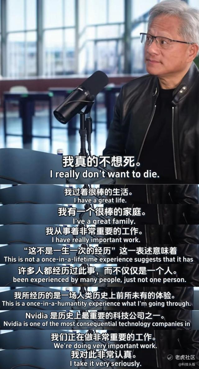 黄仁勋的第一反应是防御性的:“首先我真的不想死,我的生活很美好,有一个很美好的家庭,并且还有非常重要的事做。”