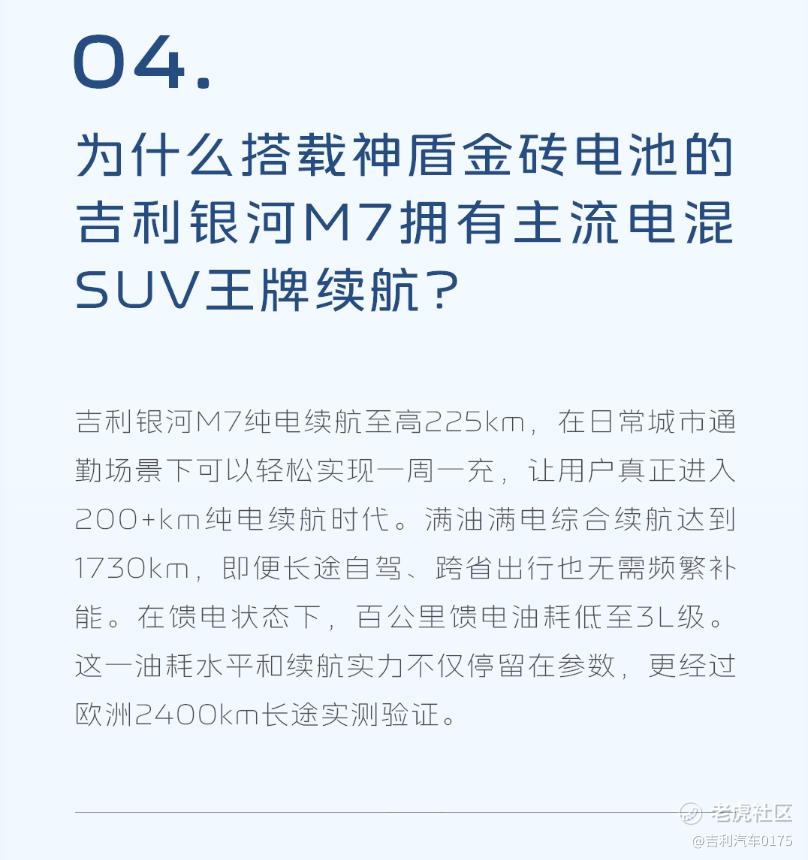 *"一周一充”是根据一周五个工作日计算。主流城市按日均往返20km,一周通勤总里程约10Okm;部分通勤距离稍长的按日均往返40km,一周总里程约200km,吉利银河M7至高纯电225km,仍可覆盖一周通勤。