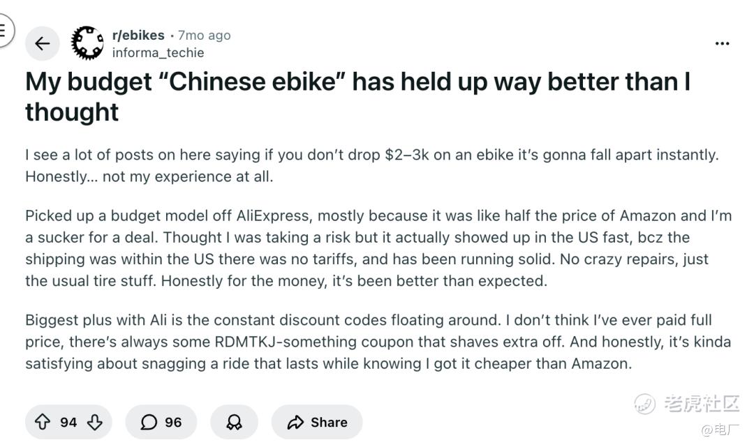 在渠道上,许多e-bike小厂选择以国际电商为媒介,工厂只负责向客户提供车源,而物流运输、线上售卖、以及售后都由第三方负责。海外论坛Reddit上,许多海外消费者表示低价的中国e-bike很适合作为自己的骑行入门产品。
