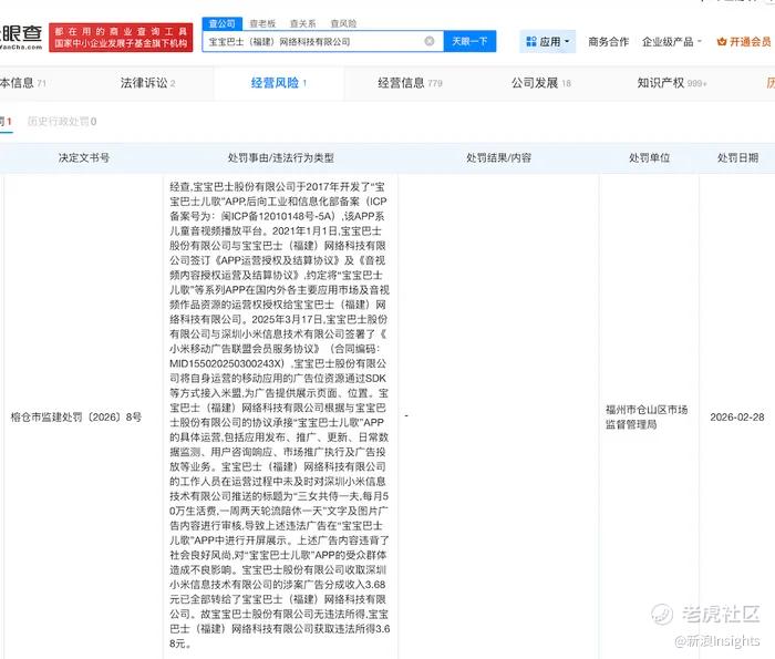 行政处罚详情显示,“2025年3月17日,宝宝巴士股份有限公司与深圳一家信息技术有限公司签署了《移动广告联盟会员服务协议》,将自身运营的移动应用的广告位资源通过SDK等方式接入米盟。在具体运营"宝宝巴士儿歌"App的过程中,宝宝巴士的工作人员未能及时对合作方推送的广告内容进行审核。”