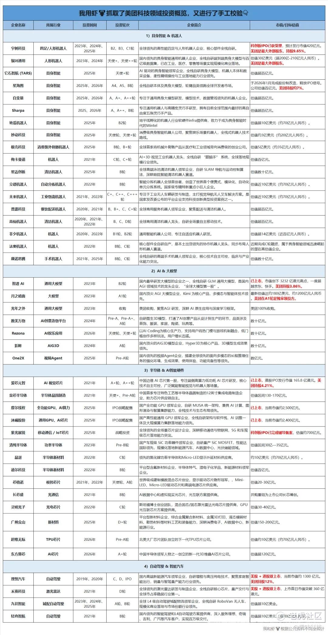 根据2026年上半年财报,美团对外资投资以400亿元入账,实际价值远远不止。除了大家都知道的理想汽车100多亿港元,智谱美团持股市值100多亿港元,宇树科技按照招股书也持有40亿元人民币市值,宇树直接上科创板,IPO估值才420亿,上市之后不知道翻几倍。还有今年跟宇树科技一起上春晚的银河通用,美团也是最大外部股东。荣芯半导体、沐曦股份、摩尔线程、紫光展锐也都投了。我用龙虾抓取了美团在科技领域的投资,横跨具身智能&机器人;AI&大模型;半导体&AI智能硬件;自动驾驶&智能汽车……,红色部分是有公开数据披露的,还有很多未公开持股比例的。详见下图: