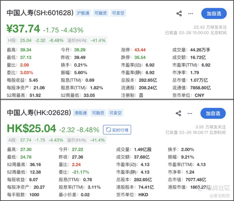 业绩发布会当日,中国人寿股票迎来A、H股双跌。截至3月26日收盘,中国人寿A股报37.74元/股,下跌4.43%,总市值1.07万亿元;中国人寿港股报25.04港元/股,下跌8.48%,总市值7077.46亿港元。