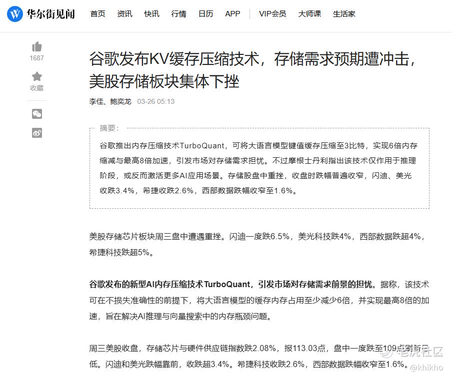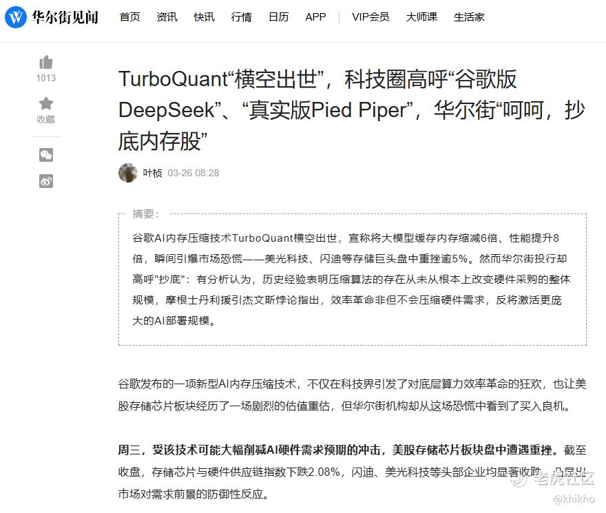 2026年3月25日,也就是周二,Google Research发布了一项名为TurboQuant的AI记忆体压缩技术,宣称可将大型语言模型(LLM)的记忆体使用量降低至少6倍,同时维持模型准确性不受影响。消息公布后,记忆体类股,立马就在周三(也就是隔天3月26日)遭遇集体重挫。