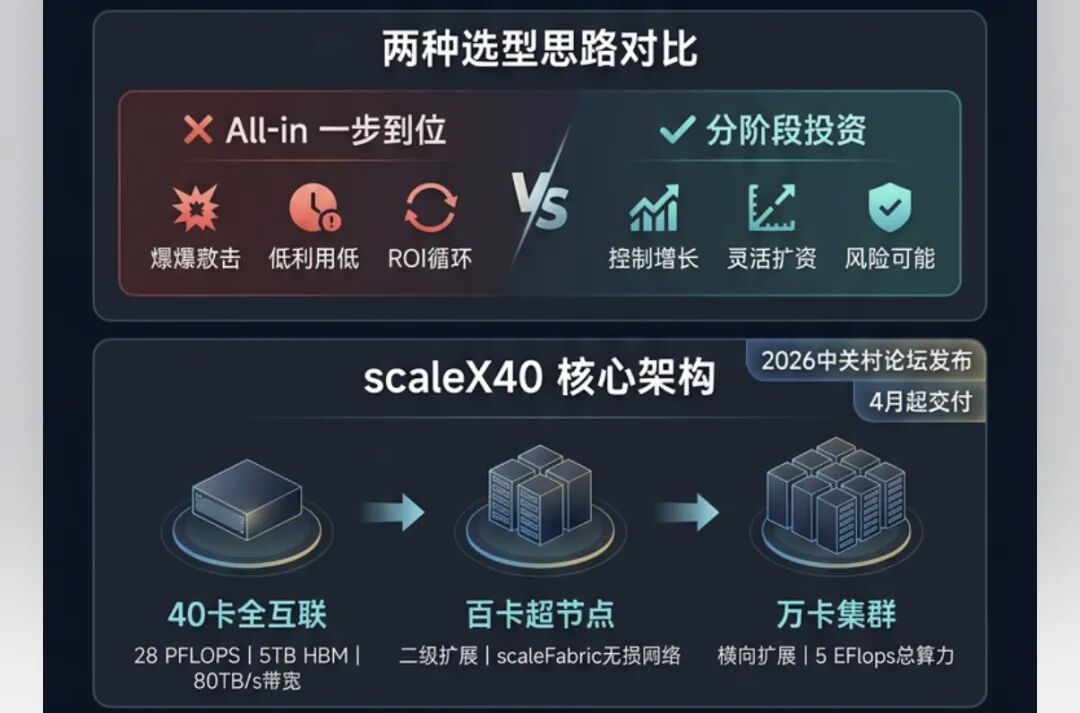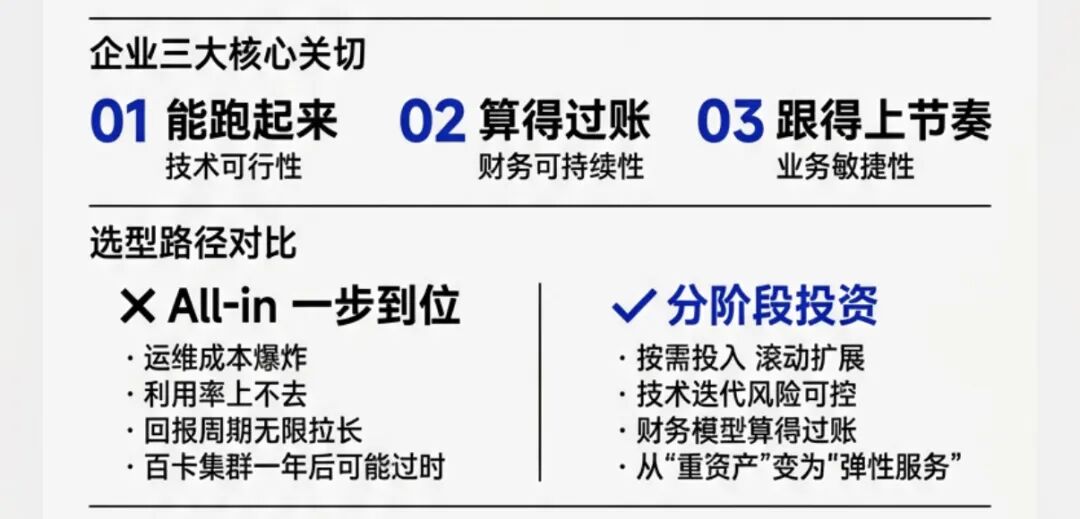 前两年很多项目翻车,就是因为只考虑了第一点,忽略了后两点。为了"一步到位"上超大规模,结果运维成本爆炸、利用率上不去、投资回报周期被无限拉长。这种"All in"式的选型,赌的是业务永远按最理想的剧本走。