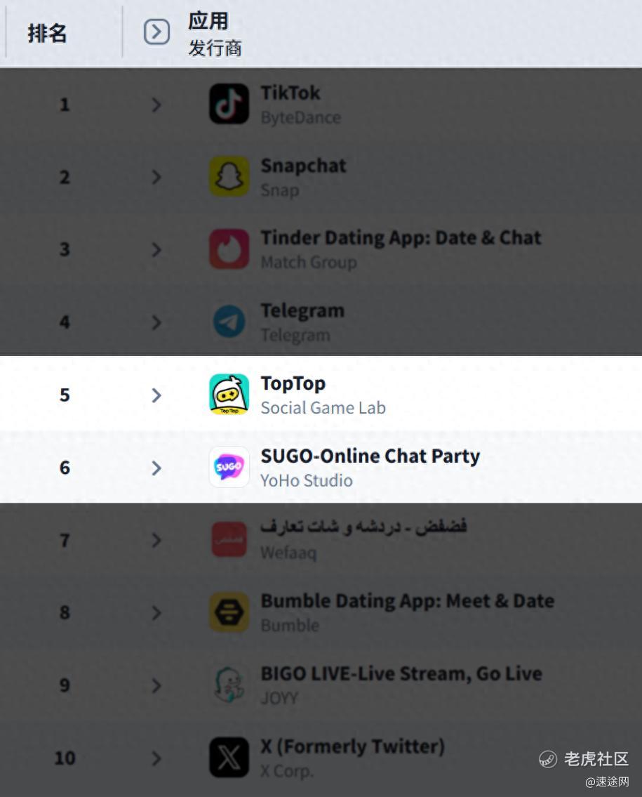 在陪伴社交赛道,SUGO 已成为全球范围内备受瞩目的标杆型产品;TopTop 则凭借 UGC 生态优势,在沙特阿拉伯等中东北非部分市场逐步成长为“国民级应用”,并斩获 Sensor Tower APAC Awards “最佳社交游戏平台” 奖项。根据 Sensor Tower 数据,TopTop 和 SUGO 分别位列 2025 年中东社交网络收入排行榜第 5 位和第 6 位。
