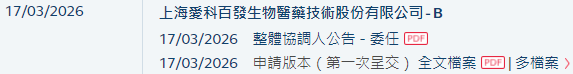 2026年3月17日,来自上海浦东新区的上海爱科百发生物医药技术股份有限公司Shanghai Ark Biopharmaceutical Co., Ltd. (简称"爱科百发”)在港交所递交招股书,拟在香港主板挂牌上市。这是继其于2025年9月15日递表失效后的再一次申请,其也曾于2021年6月29日在港交所递表。