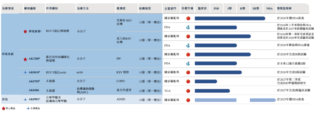齐瑞索韦,处于新药申请(NDA)阶段的专门靶向呼吸道合胞病毒(RSV)感染的治疗药物。是首款获得国家药监局“突破性疗法认定”的非肿瘤药物。2025年8月,公司向国家药监局提交了一项关于齐瑞索韦用于治疗1至24个月婴幼儿RSV的NDA申请。