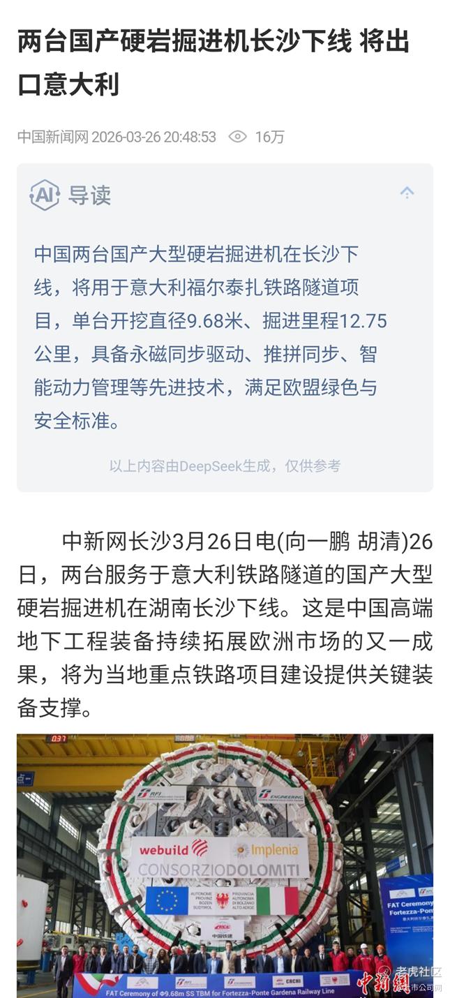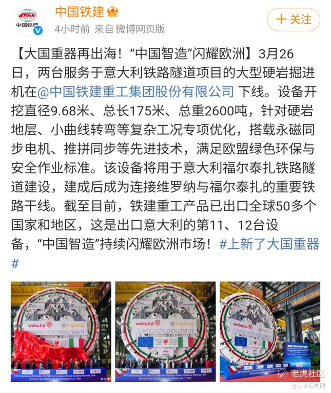 据了解,意大利福尔泰扎铁路隧道为双洞双线铁路隧道,两台掘进机将承担双线并打掘进任务,单台设备掘进里程达12.75公里,对设备的可靠性、稳定性要求极高。项目建成后,将成为连接意大利维罗纳与福尔泰扎的重要铁路干线,有效提升区域交通通行能力与运输效率,助力当地经济社会发展。
