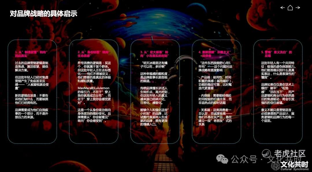 而且报告还提出了一个很重要的警告:如果品牌只是在话术上模仿”松弛感”“活在当下”“不内耗”,但产品逻辑和商业行为依然是旧的焦虑驱动,这一代年轻人会立刻识别出来,并且信任会彻底崩塌。他们有非常灵敏的”虚伪探测能力”。