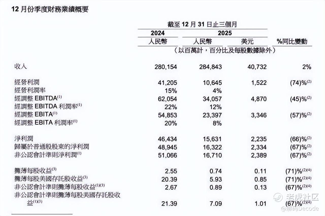 3月19日,阿里发布2026财年第三季度财报。集团收入2848亿元,同比增长2%。但归属于普通股股东的净利润同比骤降67%,经营利润降幅更大,达74%。