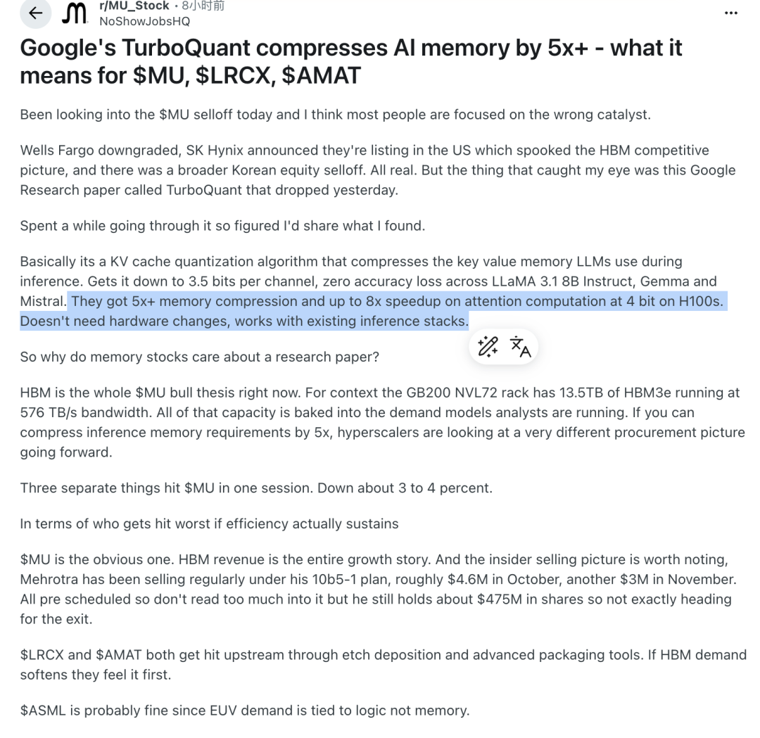 TurboQuant论文发布后,市场给出了非常迅速的反应——前段时间因为HBM而大幅上涨的存储芯片股(详见《谁在制造存储芯片荒?|甲子光年》)在今天应声下跌。很多人认为AI芯片将不再需要那么大的内存了,HBM的叙事将走弱,AI芯片的“内存墙”也将被绕过。