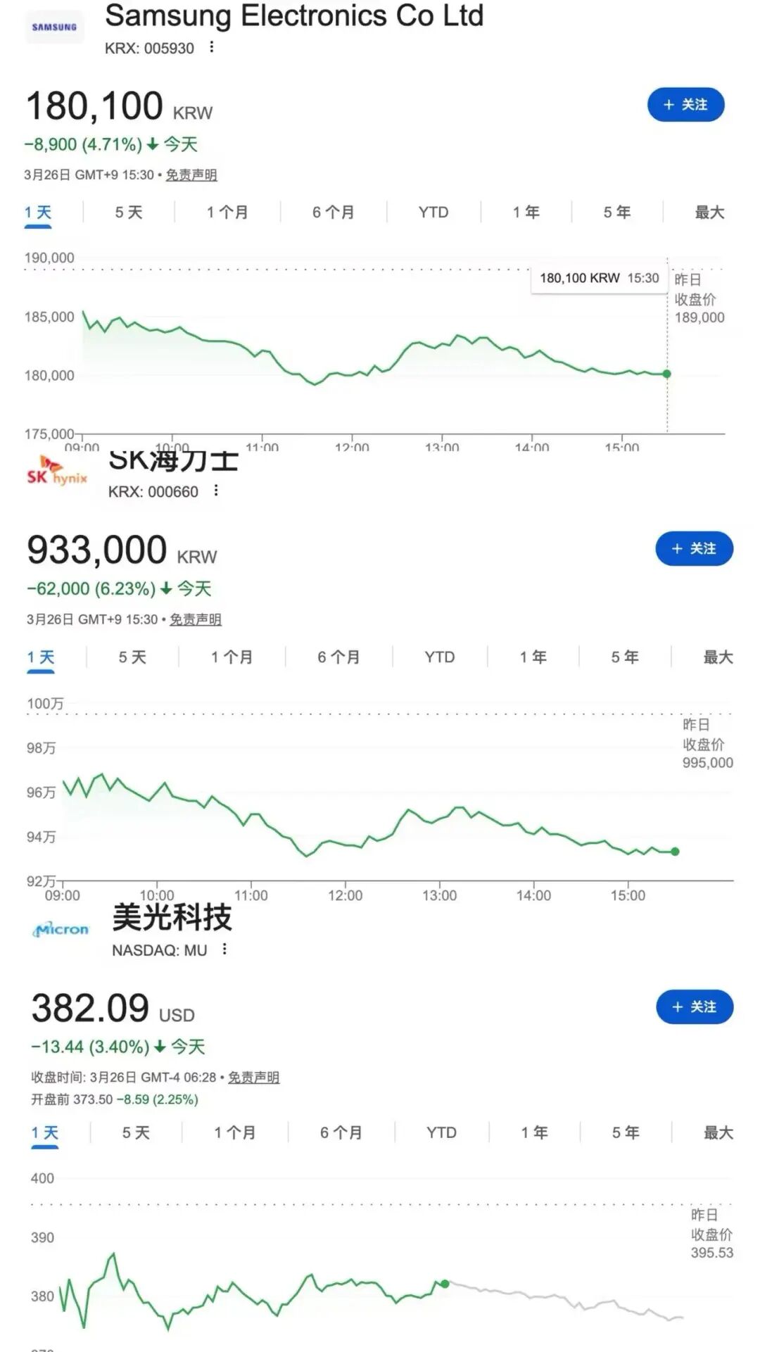 3月25日美股开盘,存储芯片板块集体遭遇“黑色时刻”。