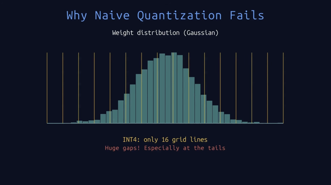 量化前后的模型权重分布,INT8精度下有256条网格线,INT4精度下却只有16条网格线。图源:Toutube @Tales Of Tensors 《LLM Quantization Explained: GPTQ, AWQ, QLoRA, GGUF and More》