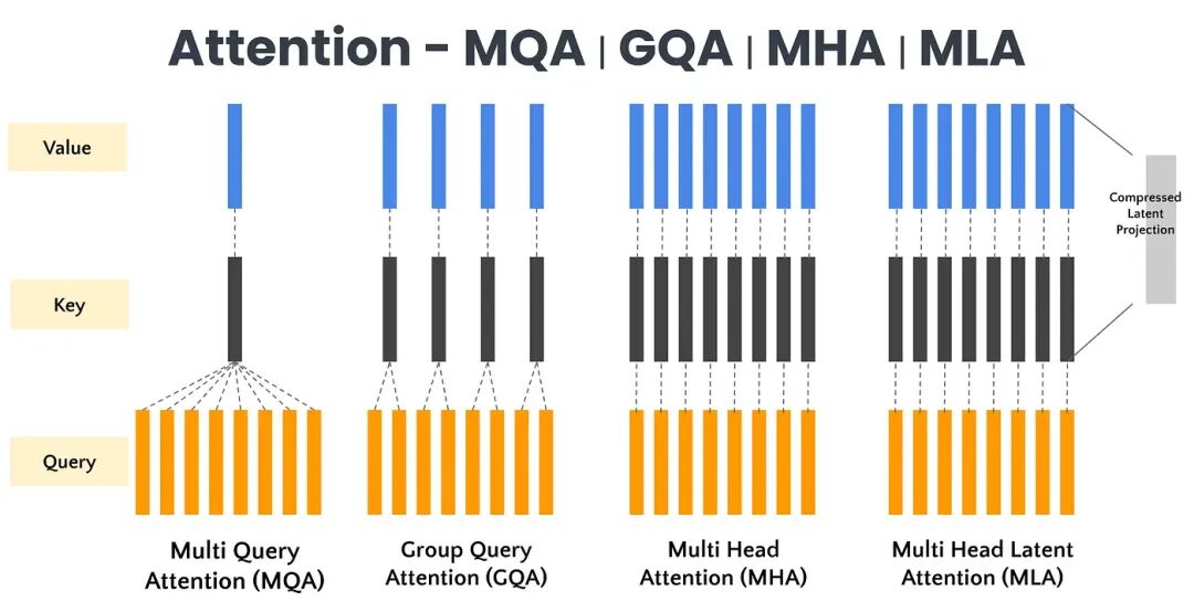 第二是从“高度”上压缩——GQA(Grouped-Query Attention)、MQA(Multi-Query Attention)等架构改进,减少Key/Value头的数量,降低每一层需要缓存的数据量。