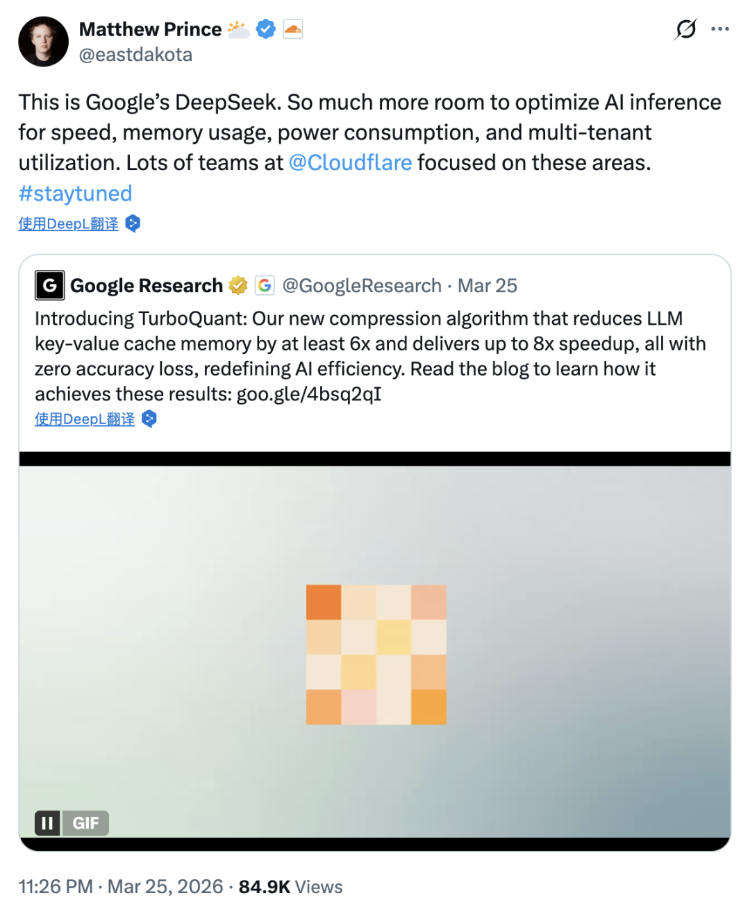 “这就是谷歌的DeepSeek时刻,它在优化人工智能推理的运行速度、内存使用量、能耗以及多租户利用率方面提供了更大的空间,Cloudflare 多个团队都在致力于这些方面的工作。”图源:X @Mattew Prince