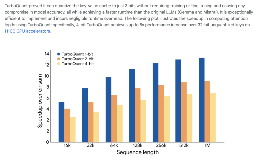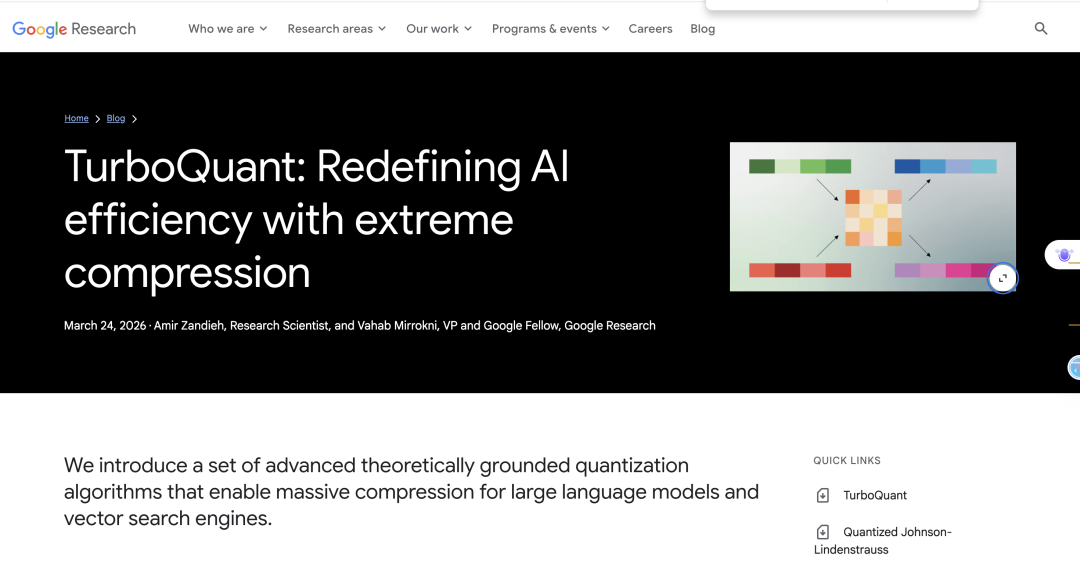 在TurboQuant的发布博客上,谷歌官方用几个数据描述了这个新算法的有效性——“3bit无损”、“8×加速”、“6×压缩”、“零预处理”。
