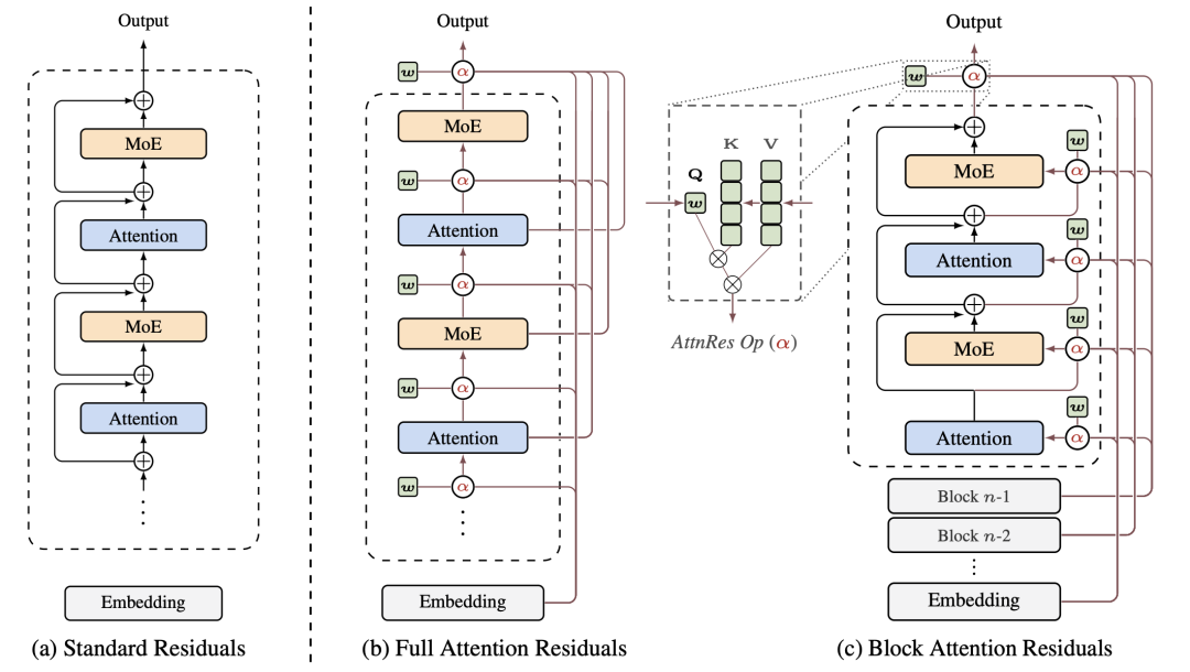 注意力残差概述。(a)标准残差:采用统一加法累加的方式进行的标准残差连接;(b)全注意力残差:每个层通过学**到的注意力权重有选择地整合所有前一层的输出;(c)块注意力残差:将层分组成块,从而将内存消耗从 O(Ld) 减少到 O(Nd)。图源:《Attention Residuals》