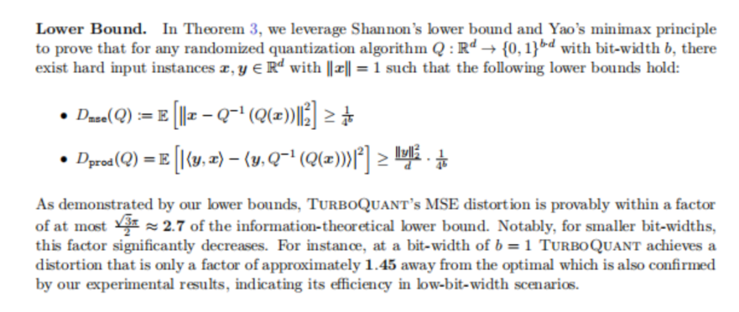也就是说,TurboQuant的失真率只比“宇宙中任何算法都不可能突破的理论极限”大约2.7倍。在低位宽下这个差距更小——1bit时仅为1.45倍。