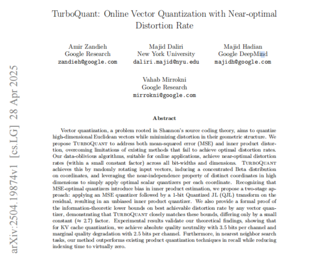 论文名叫《TurboQuant: Online Vector Quantization with Near-optimal Distortion Rate》(下文简称TurboQuant)。