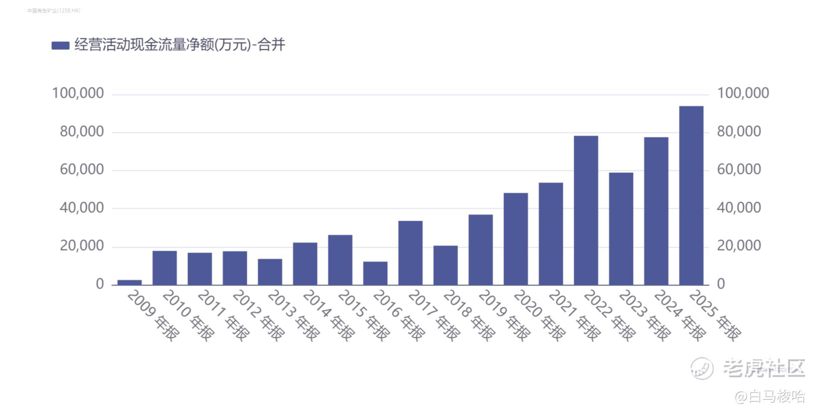 中国有色矿业的利润质量极高,其经营现金流量净额长期看历年均超过净利润。2025年,中国有色矿业经营活动净流入9.39亿美元,同比增长21.08%,创历史新高。