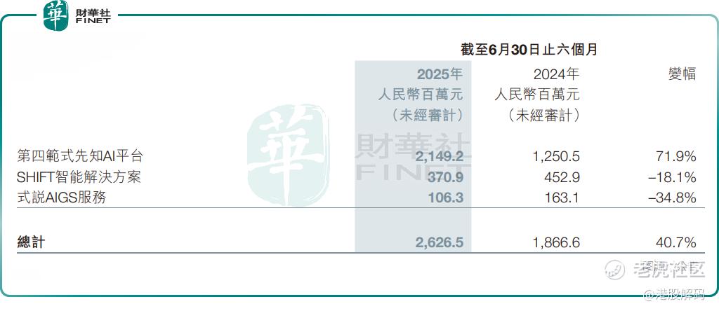 分业务来看,2025年上半年,核心业务先知AI平台收入达21.49亿元,同比大增71.9%,还要高于整体收入的增速,占总收入的比重大幅提升至81.8%,主要系集团深入推进“AI Agent+世界模型”的落地及应用,充分捕捉企业客户高价值场景下的AI转型需求。