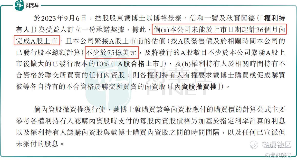 根据资料,于2023年9月28日港股上市前夕,范式智能实控人戴文渊与博裕资本等投资方达成明确条款:需于2026年9月27日前实现A股上市,且公司紧接上市前的估值不低于75亿美元,且A股发行规模不低于发行后总股本的10%。若未能达成上述条件,投资方有权要求戴文渊以个人身份回购内资股,且回购资金不得来源于公司。