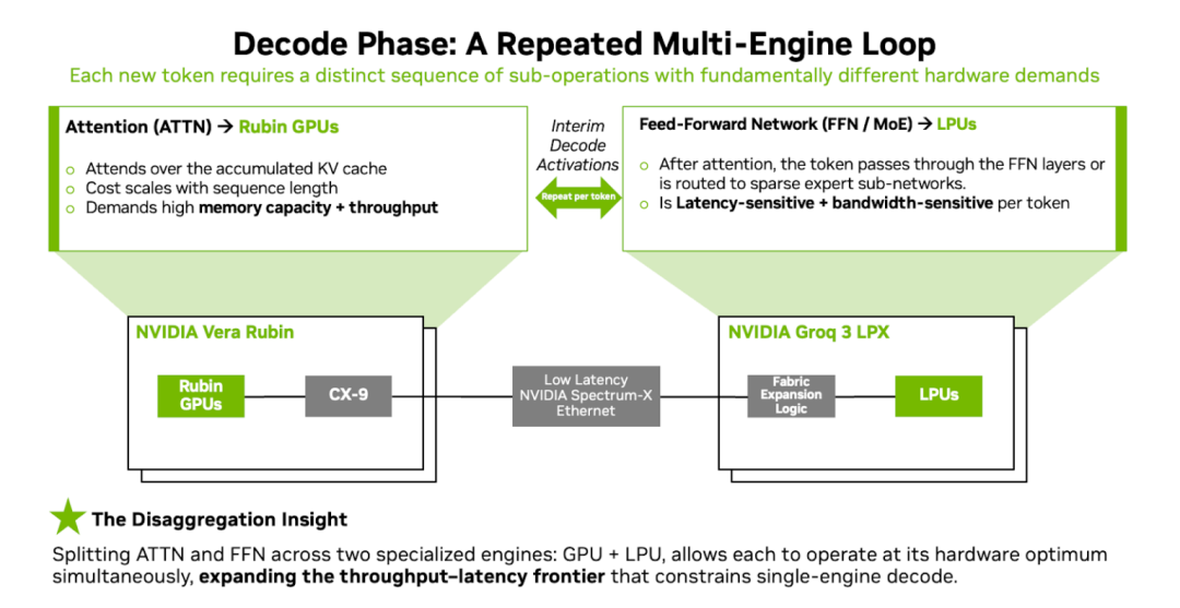 在实际运行中,英伟达将算力密集的 Prefill 任务留给 GPU,而将延迟敏感的串行 Decode 任务交给 LPU,精准的异构分工,可以AI 推理正式告别了通用芯片的“大锅饭”时代,跨入了极致响应的专业化阶段。