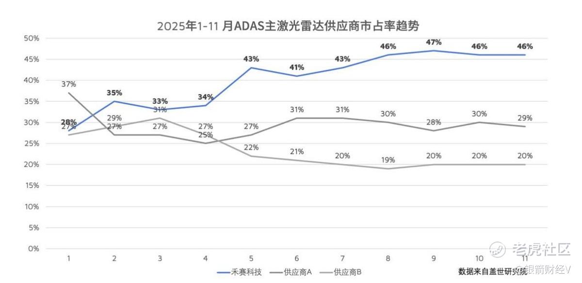 让我们用数据还原这场"倍杀"现场。根据高工智能汽车研究院数据,2025年禾赛在中国市场乘用车前装标配前向主激光雷达领域以超40%的市场份额稳居行业第一;而盖世数据的41%年度市占率,以及单月最高47%的峰值,则进一步印证了这种领先优势并非昙花一现,而是持续整个2025年的"常态化碾压"。